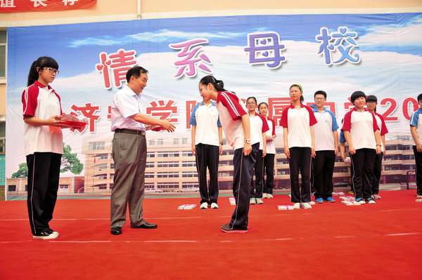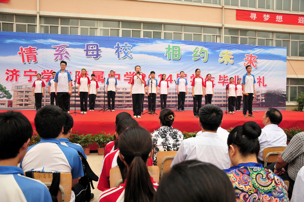 6月24日,济宁学院附属中学举行2014届学生毕业典礼,活动以师生联欢的形式呈现,学校领导、家长代表和全体毕业班师生参加。