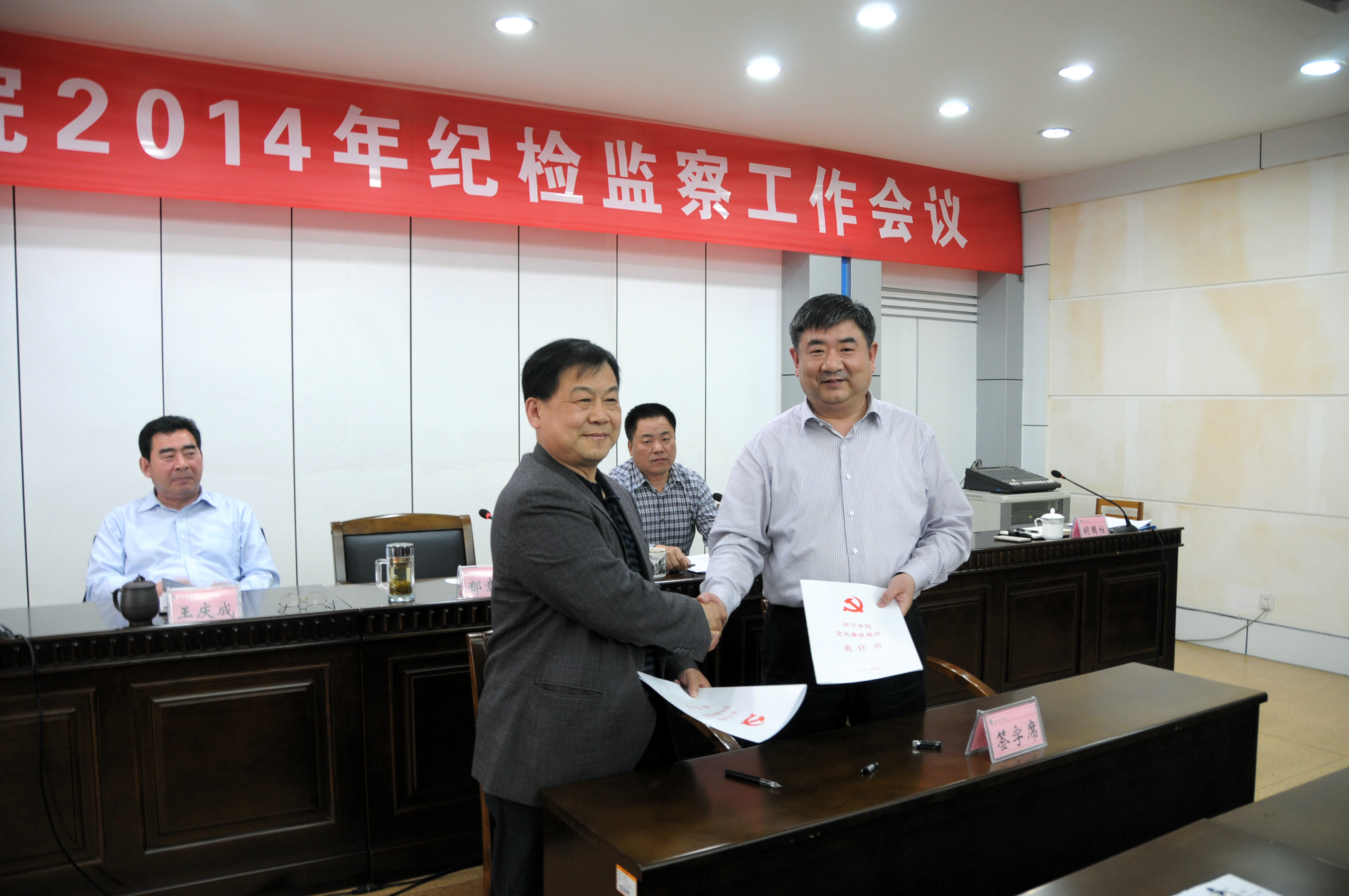 会上,郁章玉代表学校党委,与部门和单位负责人代表签订了2014年党风廉政建设责任书。校党委委员、纪委书记许记中代表纪委作了工作报告,报告从落实中央八项规定、督导党的群众路线教育实践活动、督查本科教评工作、推进惩防体系建设、加强纪检监察队伍建设等五个方面,全面总结了去年纪检监察工作取得的成效;分析了当前学校党风廉政建设面临的不足和问题;从强化监督工作落实、巩固党的群众路线教育实践活动成果、推进廉政文化建设、加强制度建设、督查重点领域和环节、严查违规违纪案件、提高纪检监察干部能力水平等七个方面,安排了今年的工作任务。纪委副书记胡国柱同志传达了中央纪委十八届三次全会和省纪委十届四次全会精神和全国、全省教育系统党风廉政建设工作会议精神。(纪 委 )