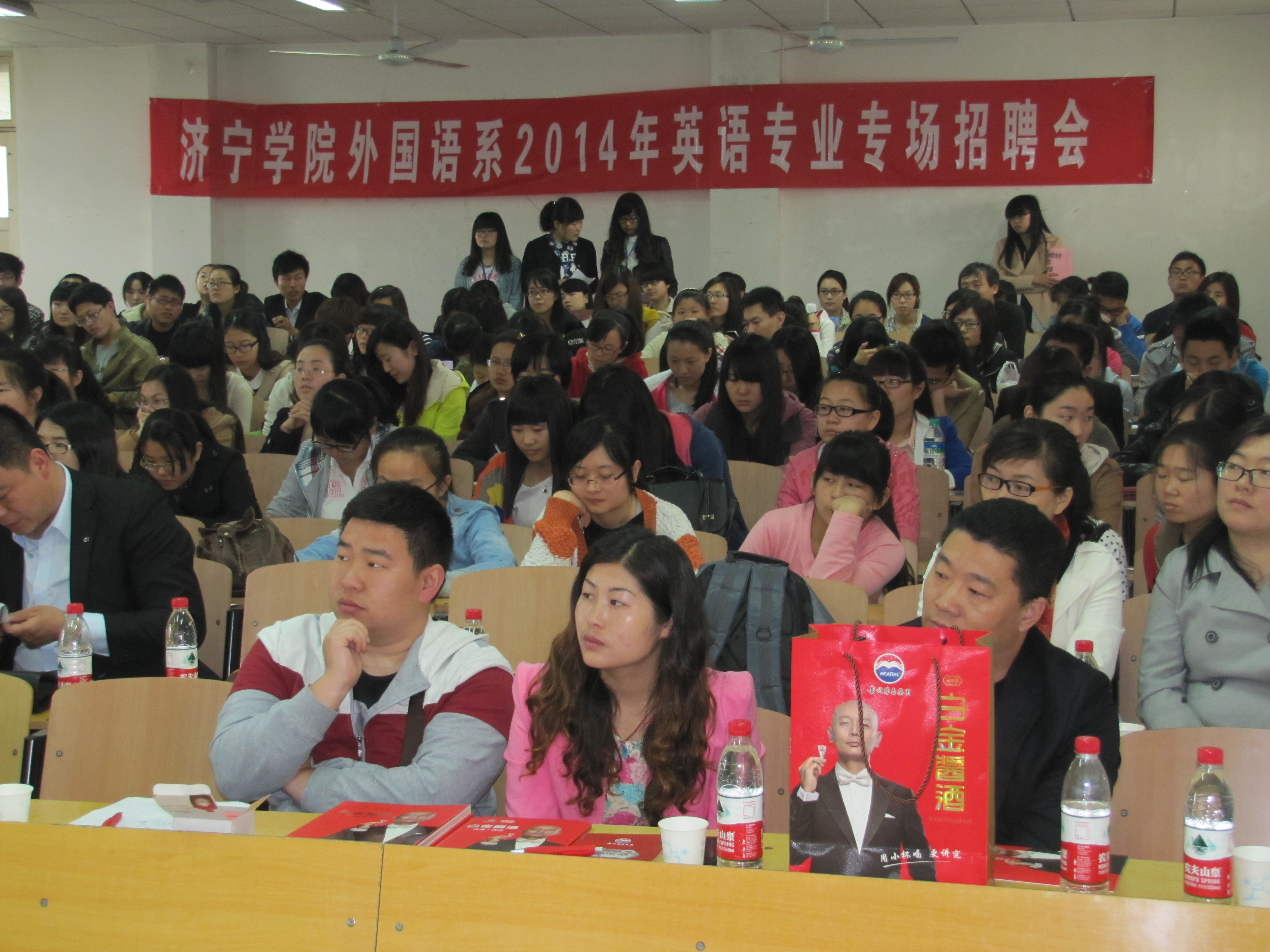 为拓宽毕业生就业渠道,推动英语专业就业工作的开展,4月20日上午,外国语系在C201举办了2014年英语专业专场招聘会。本次招聘会邀请了来自北京、上海、济南,以及济宁各县市区的16家招聘单位来到招聘会场,16家用人单位共提供了60多个就业岗位。外国语系2014届200多名英语专业毕业生参加了招聘会。各用人单位先就单位情况、招聘岗位、招聘条件等向毕业生作了集中的宣讲。随后,各用人单位分别在十多个小教室同有意向的学生展开进一步的面谈。招聘现场交流热烈,气氛活跃。部分单位下午接着进行了面试和试讲。招聘会还吸引了中文系、数学系等系部分毕业生参加。