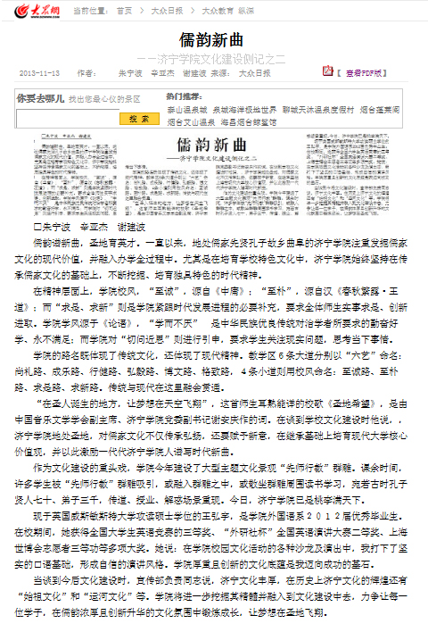 2013年11月13日,《大众日报》“纵横”栏目发表了《〈儒韵新曲〉—济宁学院文化建设侧记之二》和《济宁学院强化产学研为地方服务》,对我校文化建设和强化产学研为地方服务作了专题报道。