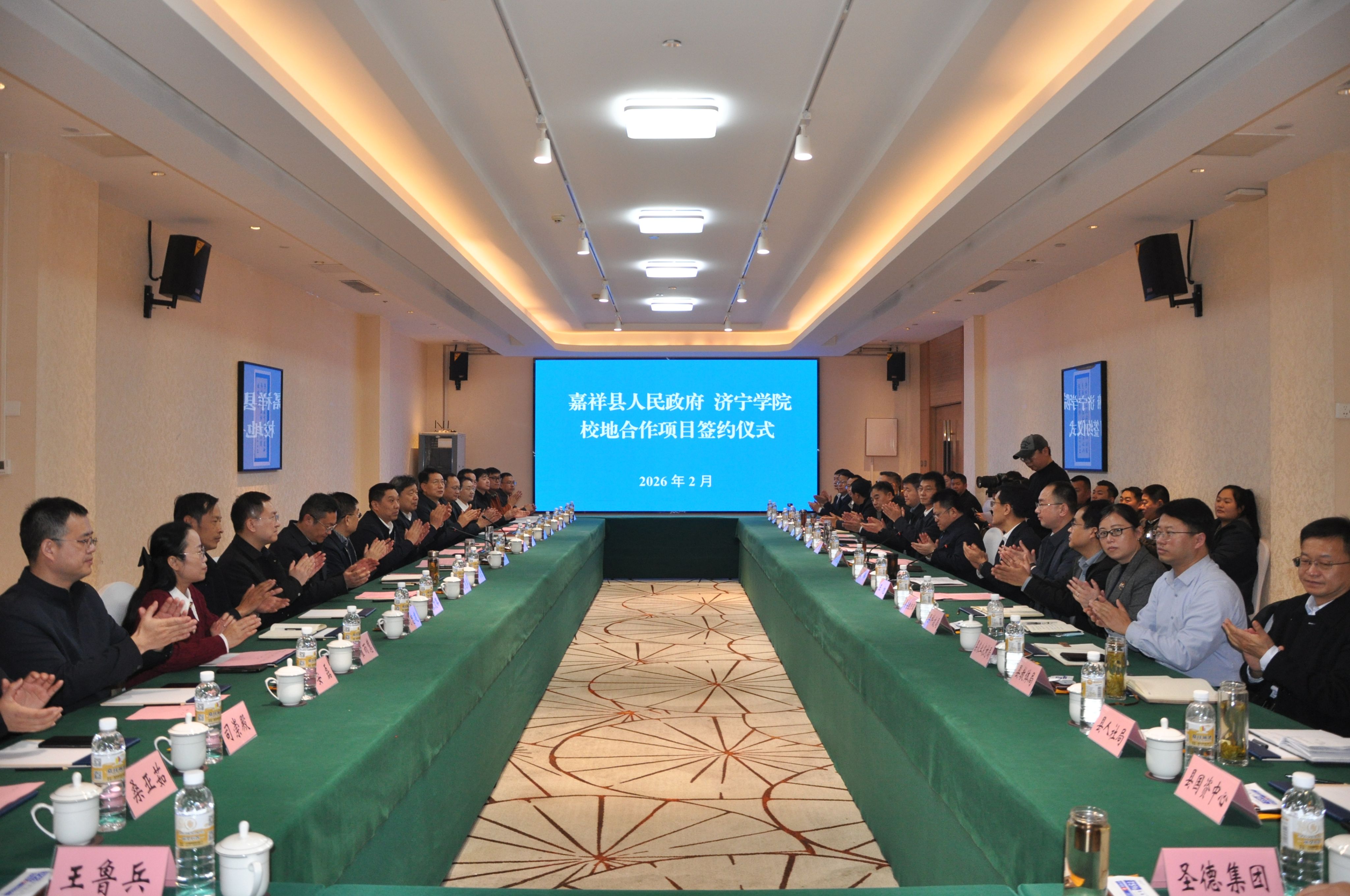 2月4日下午,济宁学院与嘉祥县人民政府正式签订校地合作项目共同推进高质量发展协议,开启双方深度合作、共谋发展的崭新篇章。学校党委书记仲红波,党委副书记、校长王清明,党委副书记丰家雷,党委委员、统战部部长张永强,党委委员、宣传部部长刘克非,嘉祥县委书记樊庆显,县委副书记、县长江峰等领导出席签约仪式。会议由江峰主持。