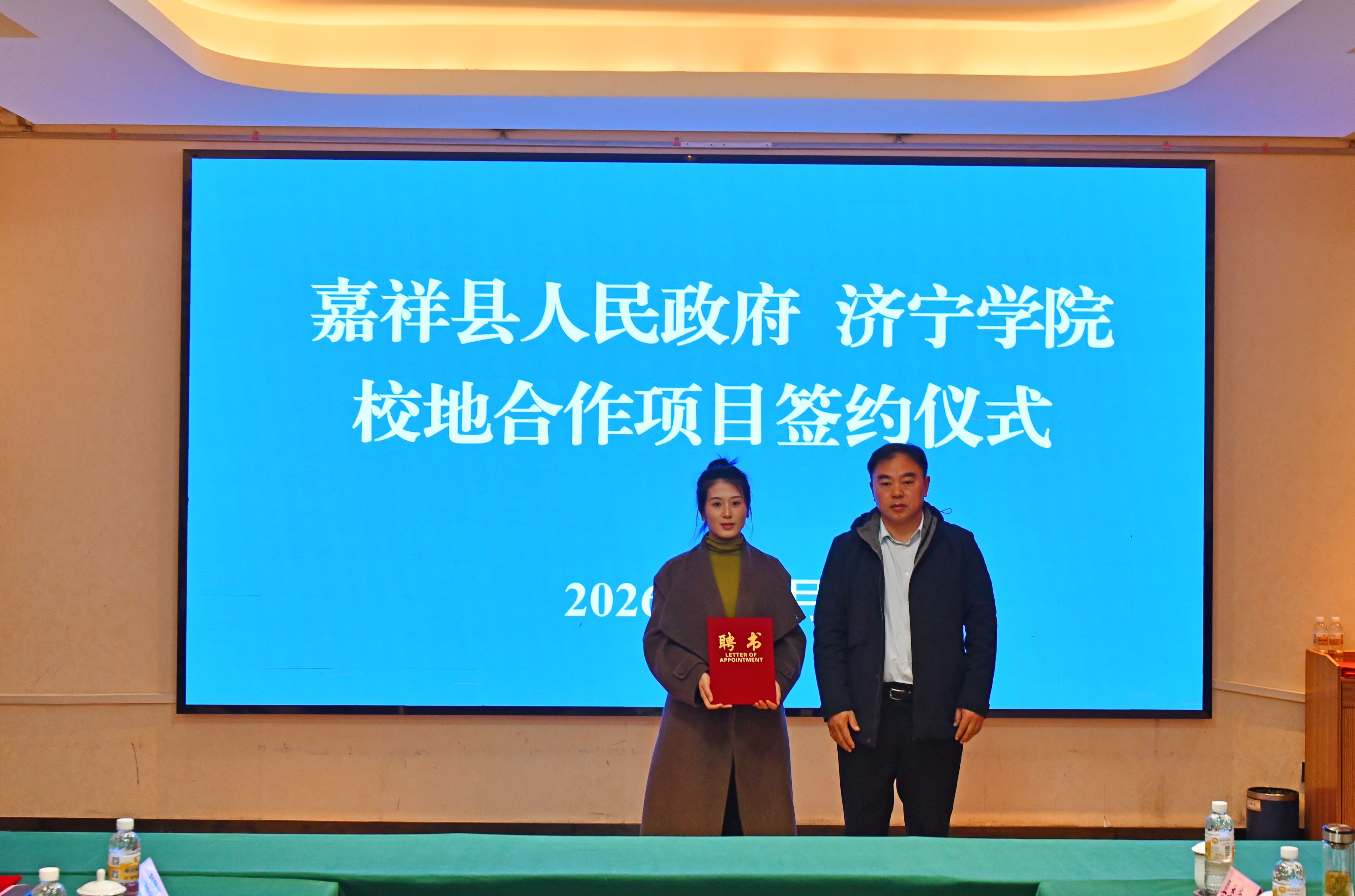 嘉祥县梁宝寺镇党委书记宋超华为济宁学院生命科学与工程学院宋晓琳博士颁发“产业发展顾问”聘书。