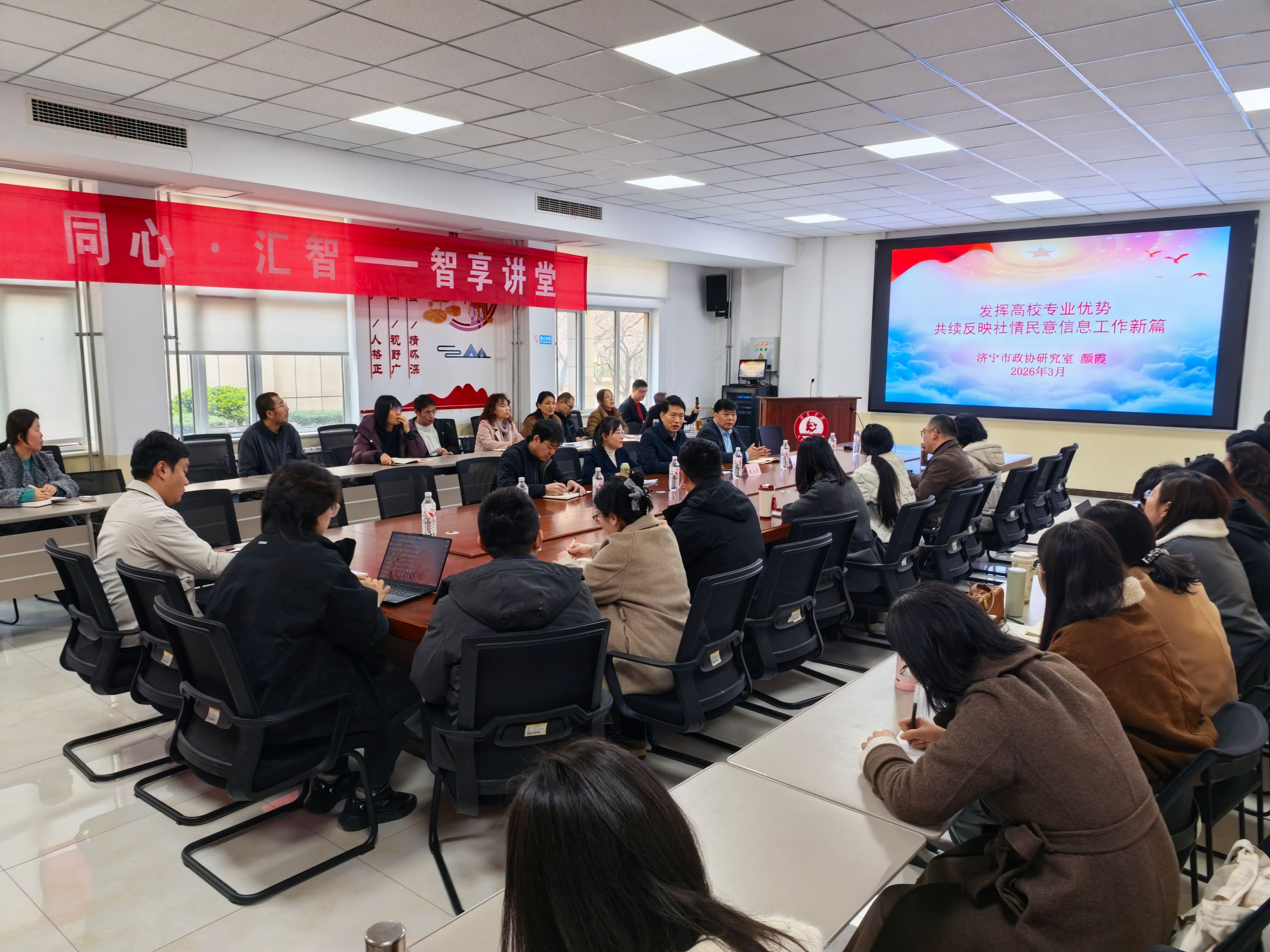 为提升我校教师参政议政能力,搭建校地统战交流合作平台,3月20日上午,党委统战部联合马克思主义学院,举办“同心·汇智”—智享讲堂首场活动,特邀济宁市政协研究室宣传和信息科主任颜霞来校作专题报告。党委委员、统战部部长张永强主持报告会,马克思主义学院党委书记李洪伟、院长王振平出席,各民主党派成员、部分知联会会员、欧美同学会会员、各二级学院教师代表参加活动。