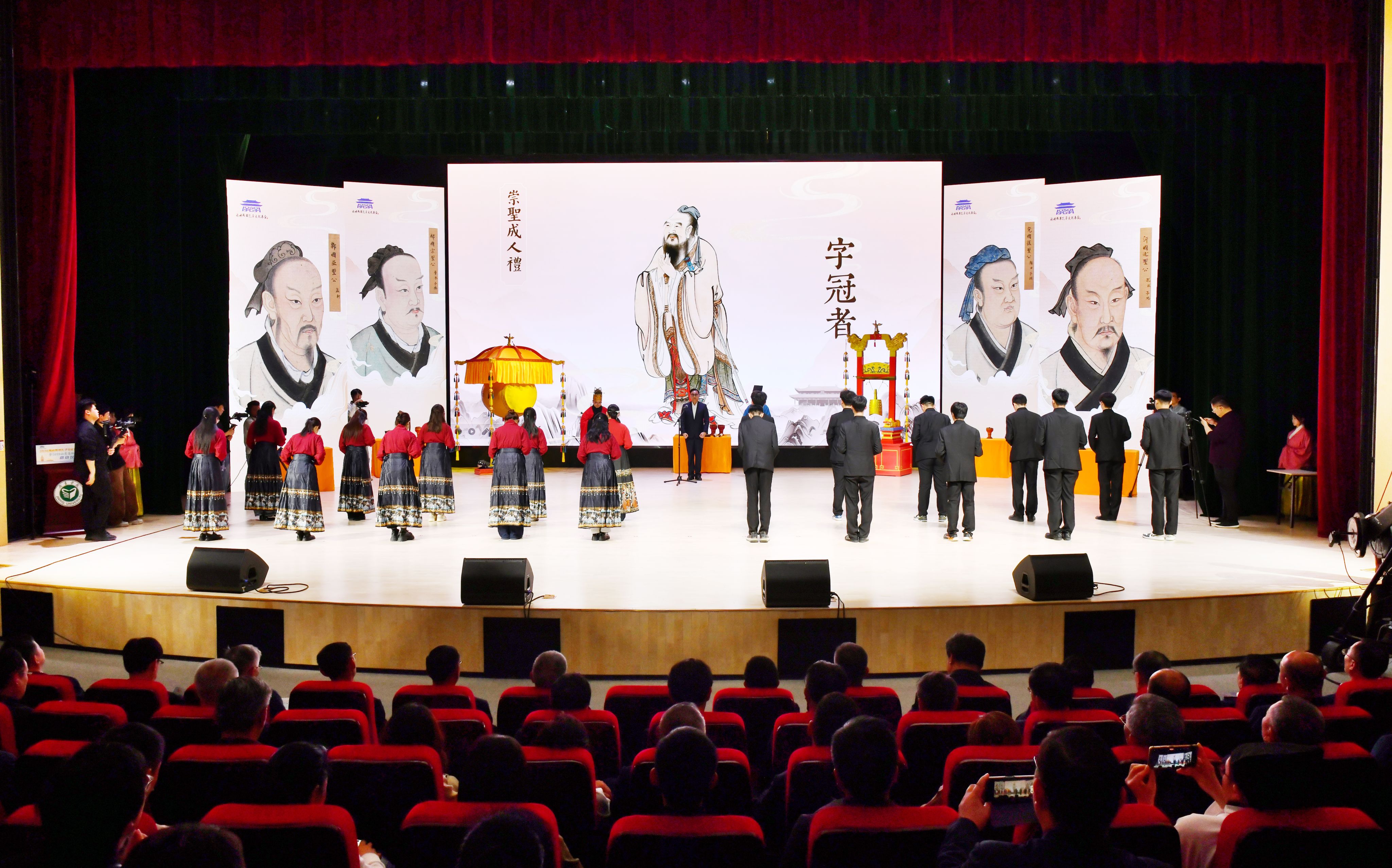 启动仪式上,精彩纷呈的文艺表演为现场观众带来一场沉浸式的传统文化盛宴。济宁学院音乐学院师生带来的舞蹈《香扇藏春》,以曼妙舞姿诠释东方女性的温婉雅致与独特美学;独唱《幸福中国一起走》,用嘹亮歌声传递对祖国繁荣昌盛的美好祈愿;舞蹈《橘颂》融乐舞之美与先贤品格于一体,在翩跹舞步中赓续中华文脉;歌舞《尼山谣》以悠扬旋律和动人舞姿,勾勒尼山钟灵毓秀之貌,诉说儒家文化源远流长之韵。台湾朋友带来的《春祭佾舞》,融合礼、乐、舞,以典雅的舞蹈语言传递对先师孔子的崇敬之情,以及对中华优秀传统文化的坚守与传承。在崇圣成人礼环节,20名品学兼优的学子接过家长与老师寄予的责任与期许,完成从少年到成年的蜕变,在传统文化的浸润中体悟成长的意义。