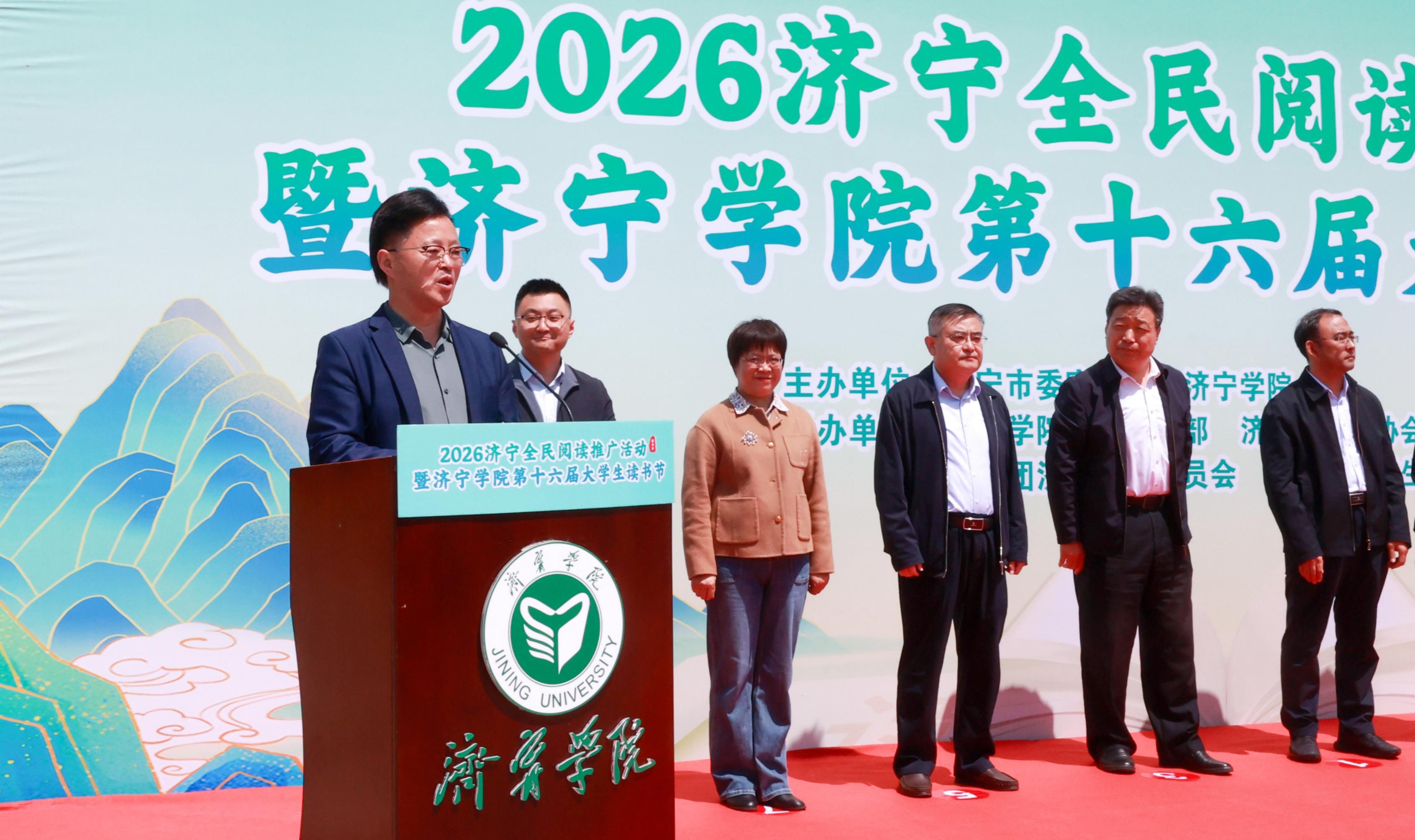 4月24日上午,由济宁市委宣传部、济宁学院联合主办的2026济宁全民阅读推广活动暨济宁学院第十六届大学生读书节拉开帷幕。济宁市委宣传部副部长、市新闻办主任张永,济宁市读书协会会长郭玉应邀出席。学校党委书记仲红波,党委副书记、校长王清明,党委副书记丰家雷,党委委员、副校长尹春光出席开幕式。学生工作处、校团委、图书馆负责人以及各二级学院党委书记、副书记、团委书记、师生代表参加活动。学校党委委员、宣传部(教师工作部)部长刘克非主持开幕式。