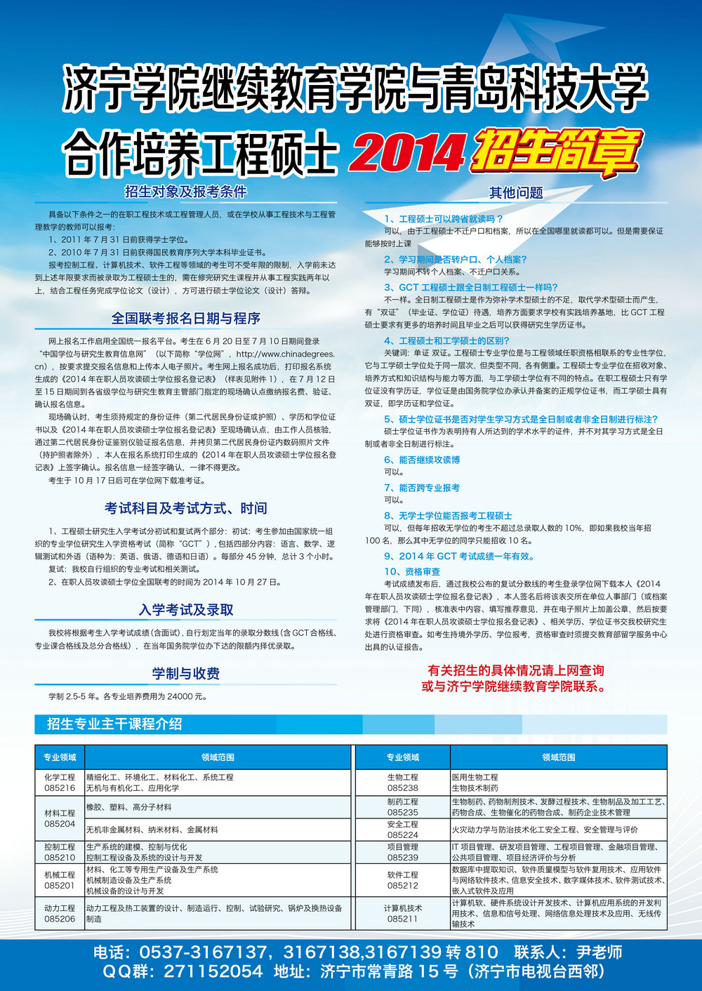 联合培养工程硕士的主要专业是:化学工程、材料工程、控制工程、机械工程、动力工程、生物工程、制药工程、安全工程、项目管理、软件工程、计算机技术共计11个专业。
