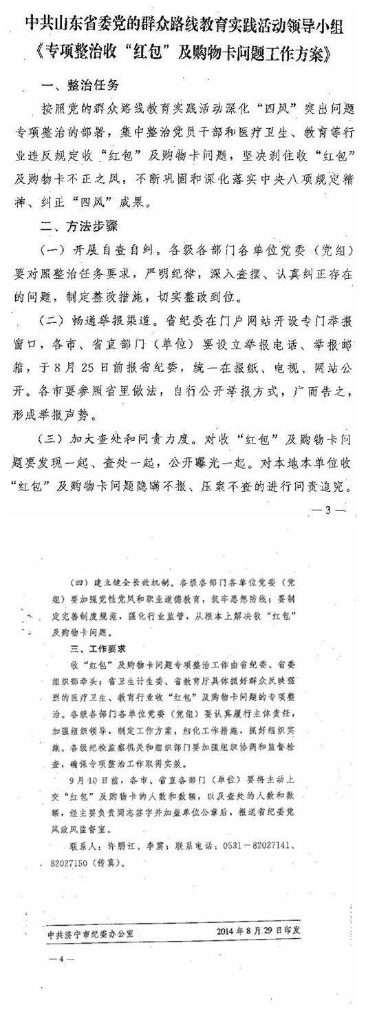 近日,省委党的群众路线教育实践活动领导小组印发了《专项整治收“红包”及购物卡问题工作方案》(鲁群组发〔2014〕33号)。根据《工作方案》的要求,现将有关事项通知如下: