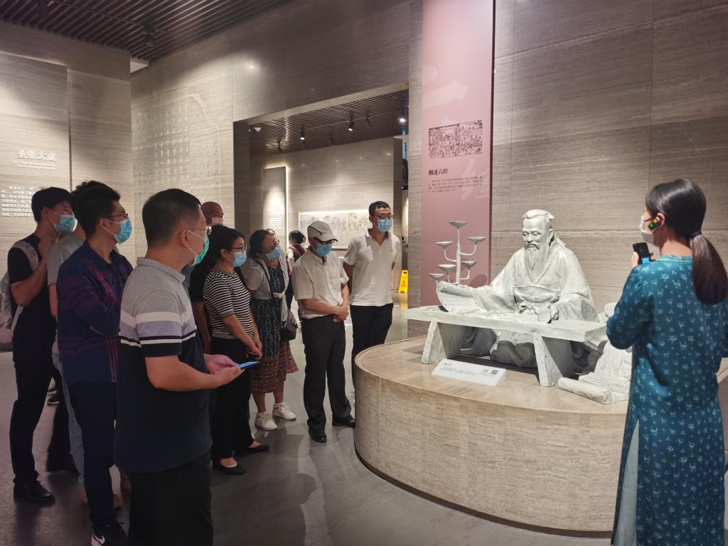 在讲解员的带领下,大家参观了孔子博物馆的三层楼,分为上行和下行空间,二者由序厅和五个展厅构成。进入博物馆,映入眼帘的便是偌大的书墙,营造出一个庄重、纯净的空间,参观各展区的历代文物、历史图片、文字介绍、视频展示、实物场景和沙盘模型,体验到历史文化和现代科技交互融合,犹如穿越千年与孔子对话,给每一名党员同志带来了心灵的震撼。