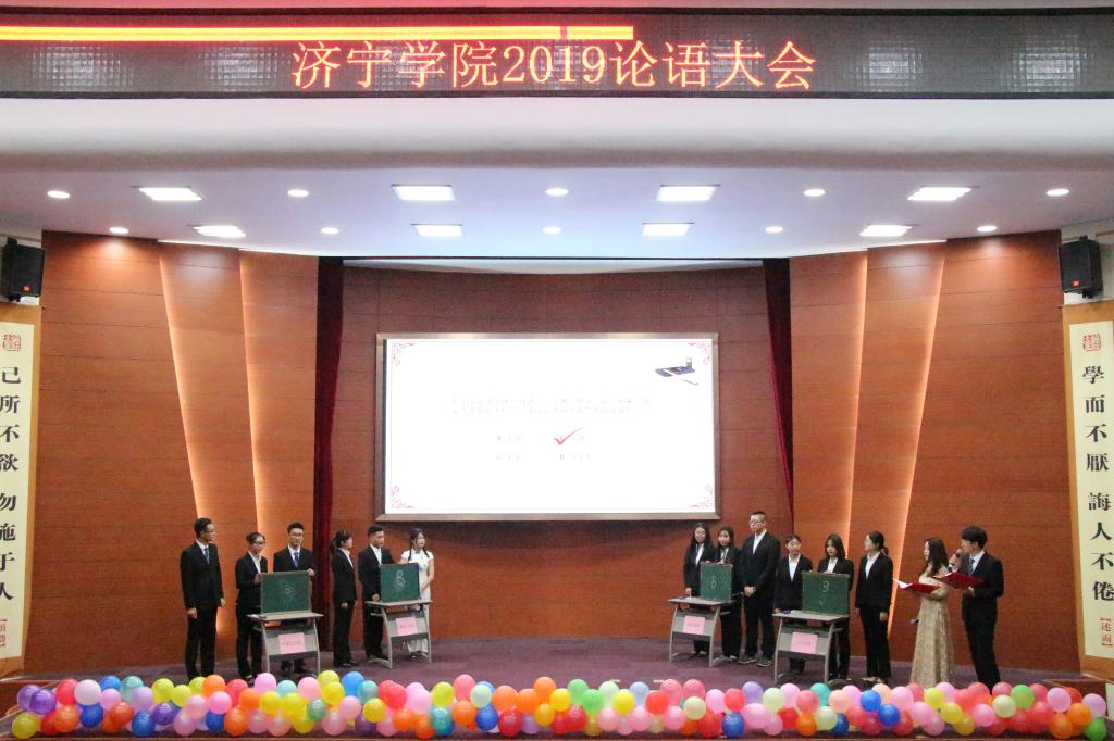 5月30日晚,由校团委主办,中文系团总支承办的“济宁学院2019论语大会”在理科楼报告厅圆满落幕。校党委副书记马恩出席活动并为获奖团队颁奖。文化传播系周新芳、中文系赵雷、田耕、王永超4位专家应邀担任大赛评委。校团委、中文系相关负责同志、各系(院)团总支负责人与学校师生400余人观看了比赛。