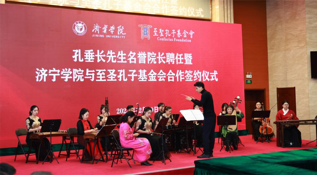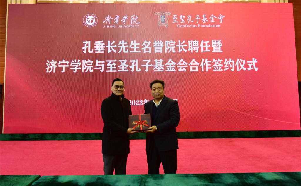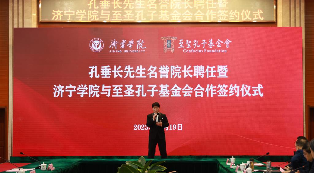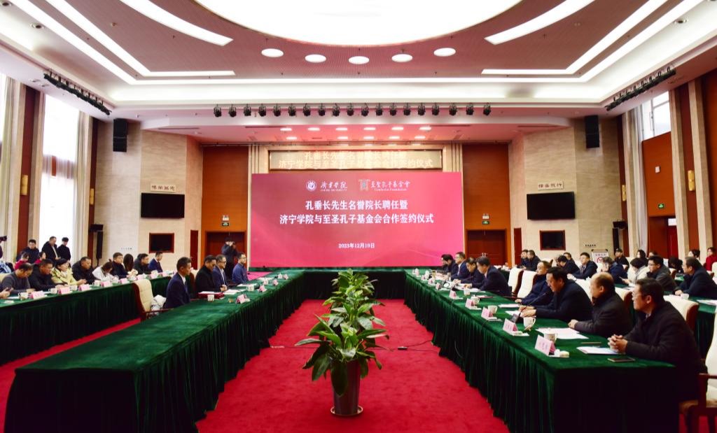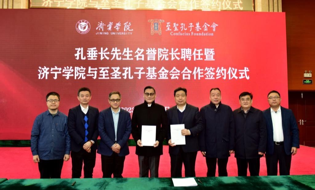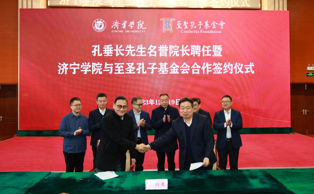 12月19日上午,孔垂长先生名誉院长聘任暨济宁学院与至圣孔子基金会合作签约仪式在我校科技楼报告厅隆重举行。济宁学院党委副书记、院长王清明,孔子第七十九代嫡长孙、至圣孔子基金会会长孔垂长出席仪式并致辞。至圣孔子基金会执行长陈泰旭、执行委员杨健、学术部主任张凝,济宁市政协副主席展鑫,曲阜市委常委、办公室主任、统战部部长、市政协党组副书记毛玉华出席仪式。校领导李凡路、赵明、孔繁润、刘国栋、刘克非,以及我校相关部门单位负责人和师生代表参加活动。仪式由济宁学院党委副书记丰家雷主持。