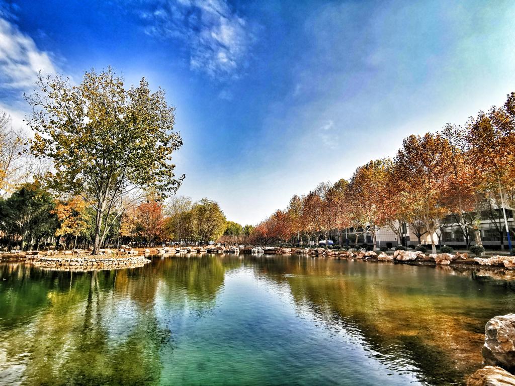脚步迈进济院北门,向西走几分钟,映入眼帘的就是我们学校校园“湖光山色“