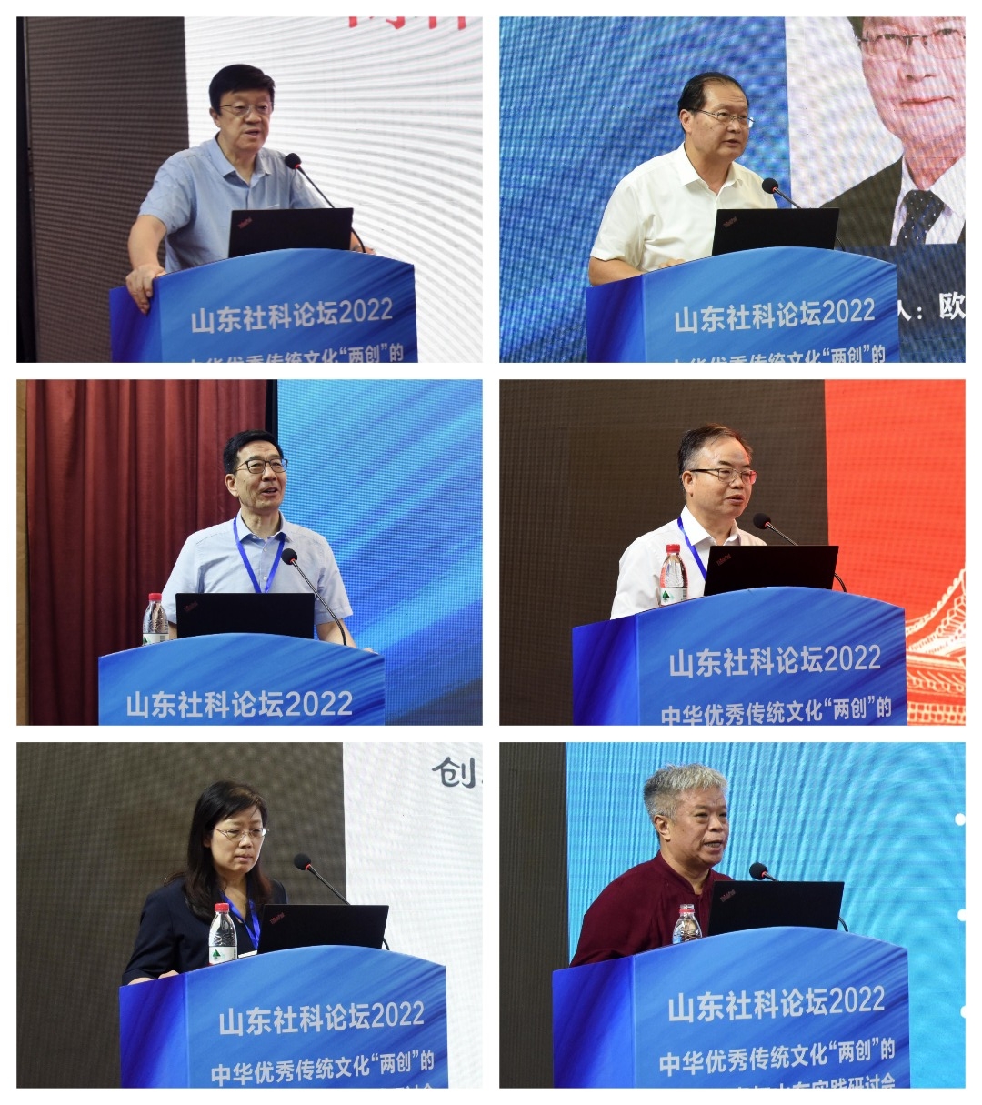 在上午的主旨演讲阶段,中央党校一级教授、中央党校专家工作室领衔专家韩庆祥,山东大学特聘教授、国际儒学联合会副理事长、全国政协委员杨朝明,教育部“长江特岗学者”、华中科技大学国家治理研究院院长欧阳康,教育部“长江学者”特聘教授、中国人民大学马克思主义学院教授杨凤城,中国社会科学院当代中国研究所副所长兼当代中国出版社社长李正华,中国社会科学院当代中国研究所文化史研究室主任、二级研究员欧阳雪梅,曲阜师范大学乡村儒学研究院院长、山东大学教授颜炳罡,中共济南市委党校(济南行政学院)副校长(副院长)、济南市社会主义学院(济南中华文化学院)院长扈书乘分别以“两种不同的文明及其与文化的关系”“让优秀传统文化扎实融入新时代”“新文明形态构建视域中的中华优秀传统文化创造性转化与创新性发展”“改革开放以来中国共产党对待孔子和儒学的认知演进”“推动中华优秀传统文化创造性转化、创新性发展的重要着力点”“新时代中华优秀传统文化‘两创’思想及实践”“颜氏家族对中华文化的四大贡献”“深刻认识马克思主义与中华优秀传统文化的内在融通性”为题进行了发言。