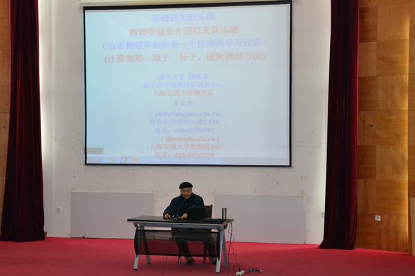 1月4日,中科院院士、清华大学和上海交通大学博士生导师李家明教授来我校访问。党委书记郁章玉、院长吕灵昌、副院长刘德胜亲切会见了李家明,并向他介绍了学校在学科建设等方面情况。下午,李家明在理科楼报告厅做了题为“基础研究的乐趣”的报告。李院士从氩原子真空紫外光吸收谱实验和空间X射线观测实验等为背景,结合自己的科研和学习经验,勉励在广大师生在学习中寻找专业兴趣,打下坚实的专业基础,并尽早确立发展方向。