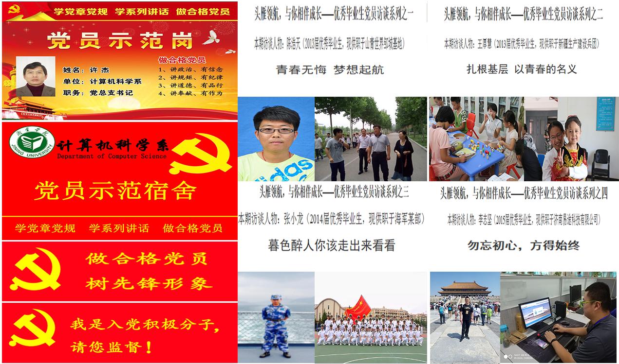 计科系党总支发挥专业优势,设计党建网页,建立计算机科学系党员QQ群、学生支部QQ群,开通系党总支、学生支部、团总支微信平台,打造出 “1+2+3”的红色网络教育阵地,围绕“两学一做”学习教育要求,开设党校在线、筑梦杏坛、青春发声、身边榜样、校园指南、素质拓展等主题推送栏目,积极宣传党的相关要求和指示精神,创新思想政治教育途径,“把党旗插上网页”。