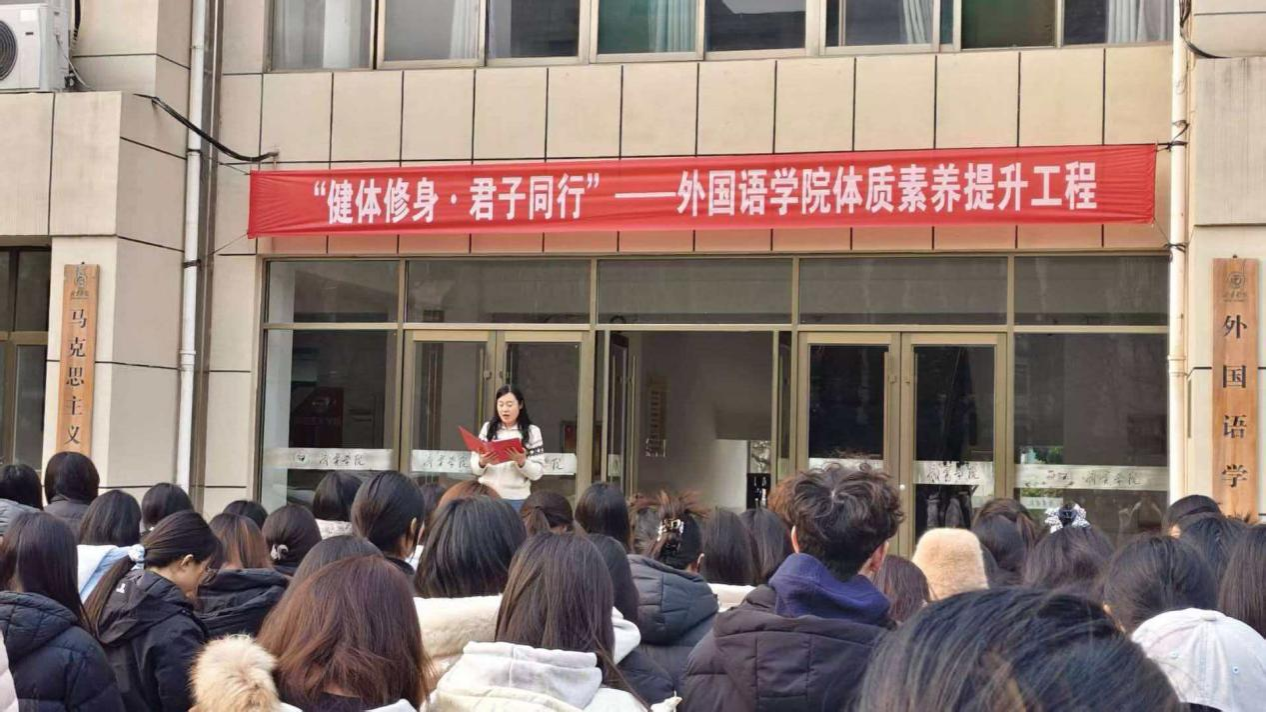春回大地,生机盎然。为深入贯彻落实立德树人根本任务,扎实推进“五育并举”,全面提升学生体质素养与综合品格,3月16日下午,外国语学院“健体修身・君子同行”体质素养提升工程开幕式在学院南广场举行。学院党委副书记文灿、全体辅导员及班主任老师、24级和25级全体学生参加活动,活动由学院团委书记姜璨主持。