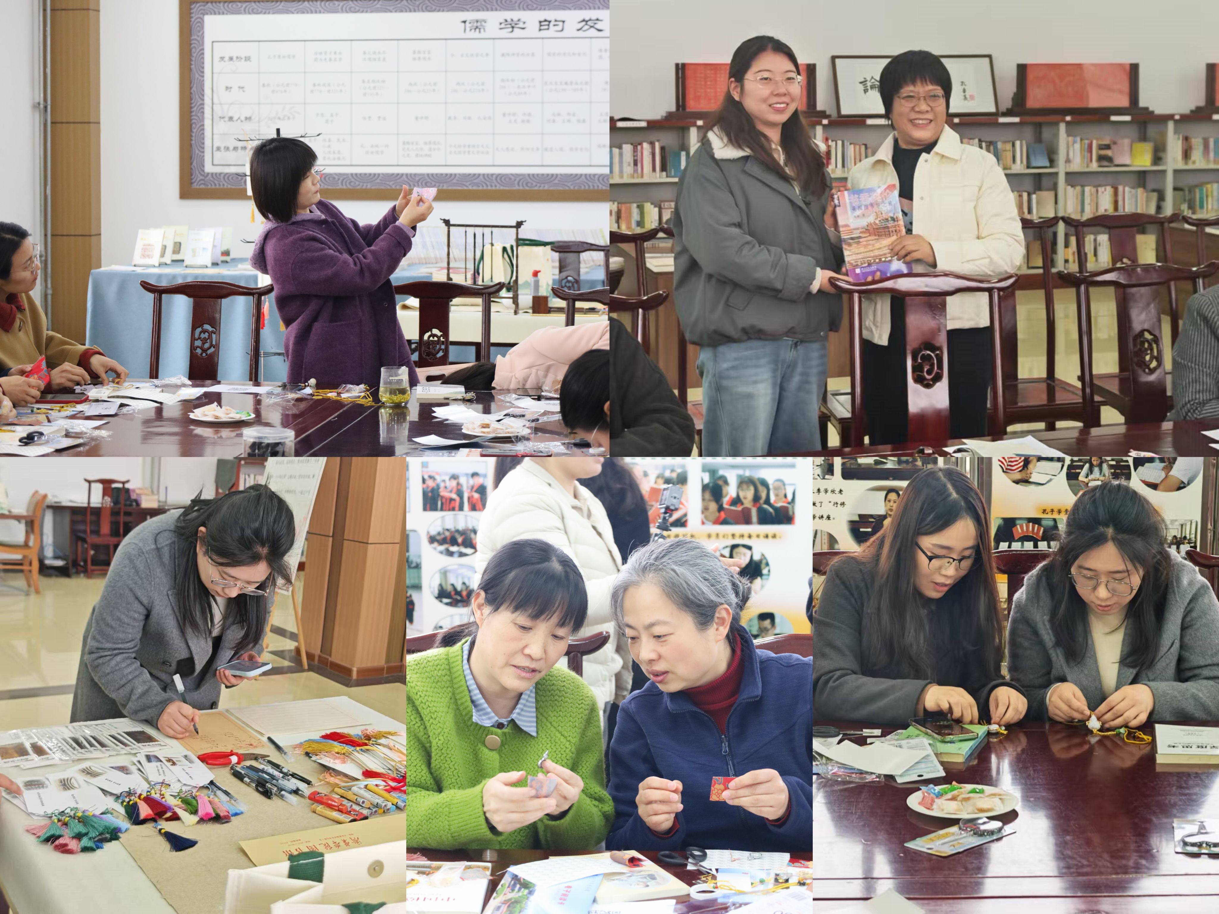 非遗手作体验环节将活动推向高潮。图书馆宋敏老师现场示范指导,带领大家体验宋锦葫芦吊坠制作。宋锦作为我国传统丝织工艺的瑰宝,质地典雅、纹样含蓄,承载着千年江南文人的审美意趣,恰与女性温润内敛、雅致温婉的气质相得益彰;而葫芦谐音“福禄”,寓意吉祥安康。老师们凝神专注,穿针引线、精细修剪、巧手打结,在一针一线的实操中沉浸式感受非遗技艺的独特魅力。当一枚枚精巧别致的宋锦葫芦吊坠在指尖诞生时,大家互相欣赏、交流创作心得,现场欢声笑语不断,温馨美好的瞬间在合影留念中永久定格。