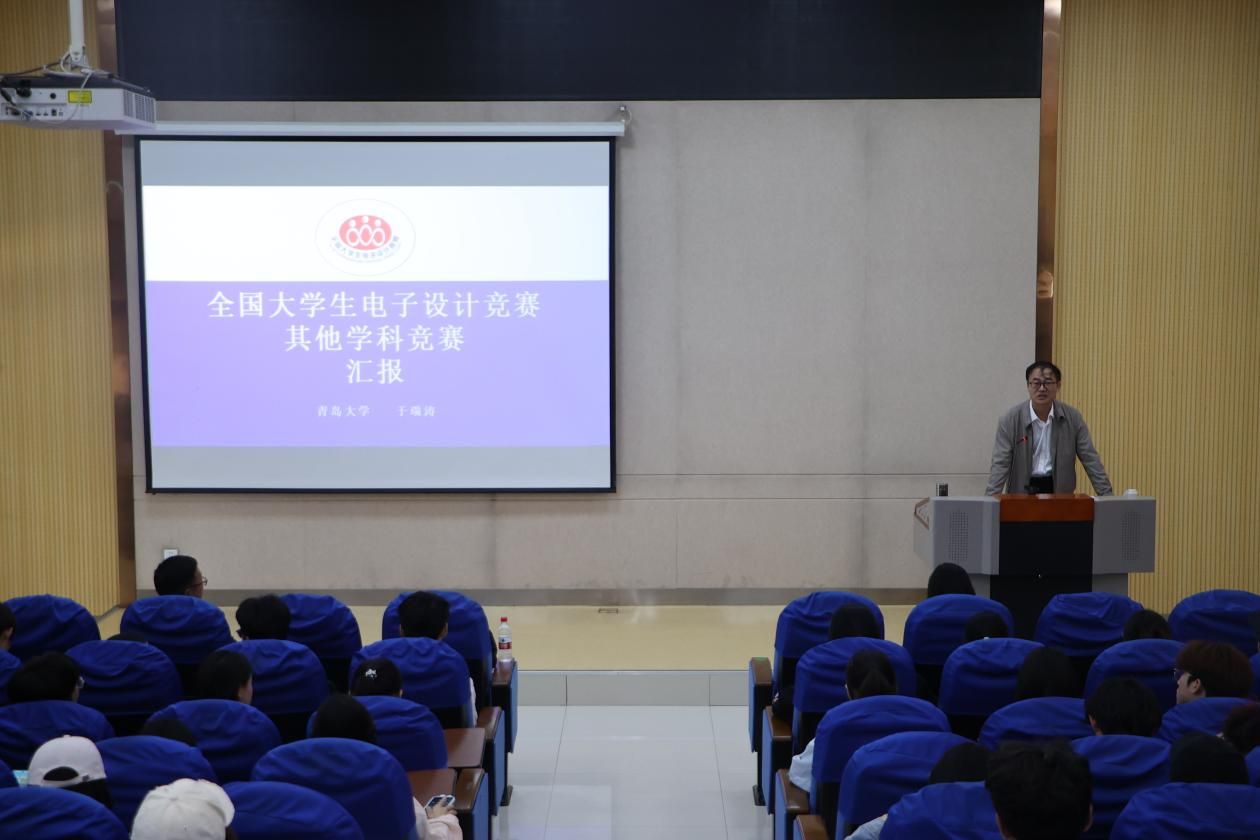为进一步提升学生学科竞赛参与能力与创新素养,4月23日下午,物理与电子工程学院特邀青岛大学教师于瑞涛开展“青创大讲堂”学科竞赛专题分享会。分享会由团委书记赵杨洋主持,学院党委副书记辛允东及全院近两百名学生参加活动。