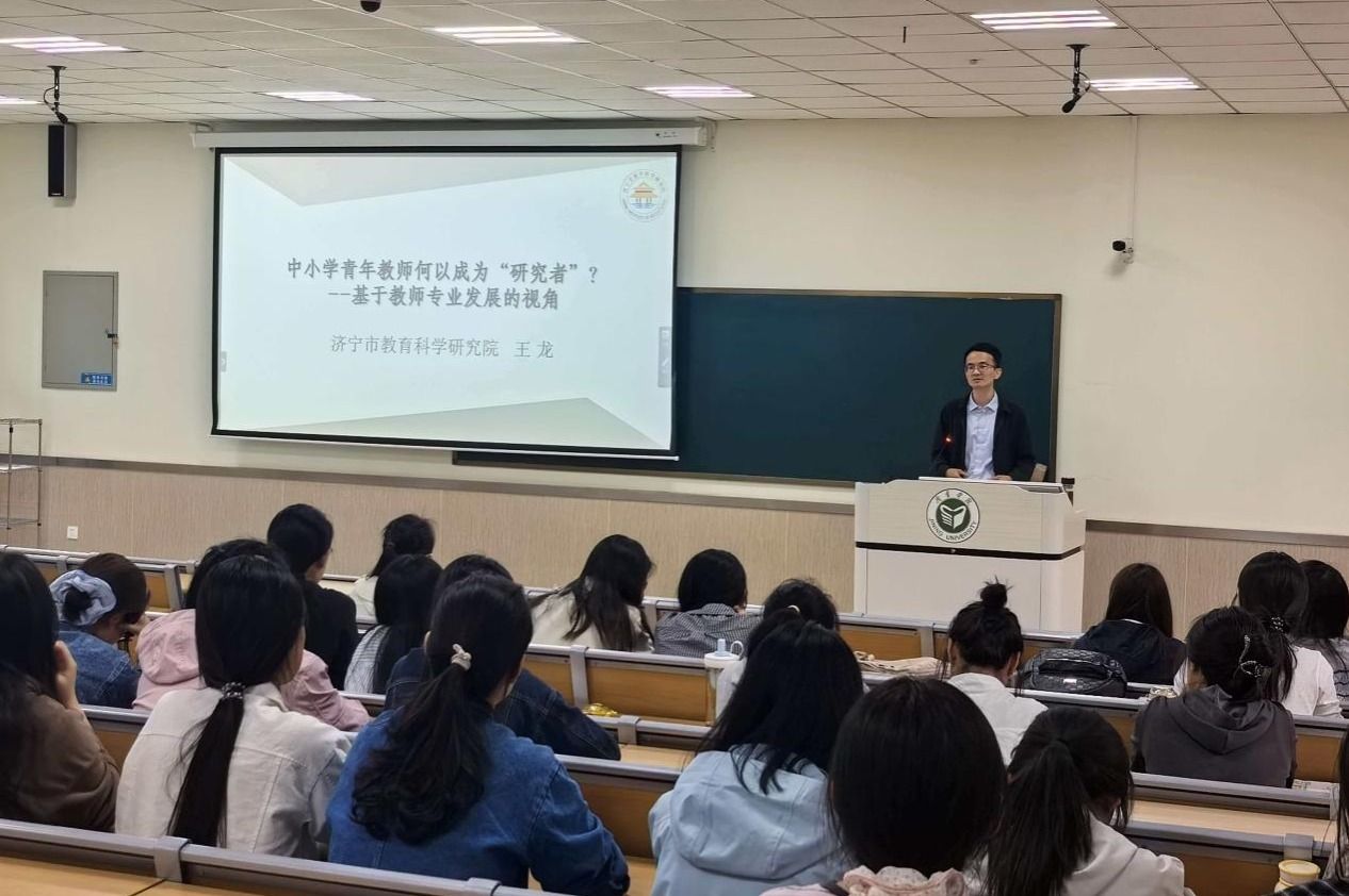 4月27日晚,外国语学院 “师范生从业技能培养工作坊” 第四十七期在3C201报告厅举行。济宁市教育科学研究院初中英语教研员王龙应邀作题为《教师成为研究者》的专题讲座,2024 级英语师范专升本专业百余名同学现场聆听。学院英语系主任陈勇主持了此次活动。