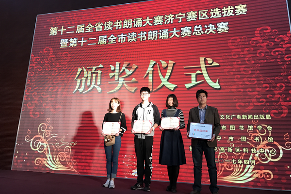 4月15日上午,由济宁市文化广电新闻出版局主办,济宁市图书馆学会、济宁市图书馆承办的,以“书卷长流,伴随一生”为主题的“第十二届全省读书朗诵大赛济宁赛区选拔赛暨第十二届全市读书朗诵大赛总决赛”在济宁市高新区科技图书馆举行。来自济宁市各县、市、区和驻济高校区33组选手参加了总决赛。经过激烈的角逐,我校图书馆选送的两组选手唐旭、刘家奇,姜彤均荣获大赛总决赛二等奖,我校图书馆获得优秀组织奖。