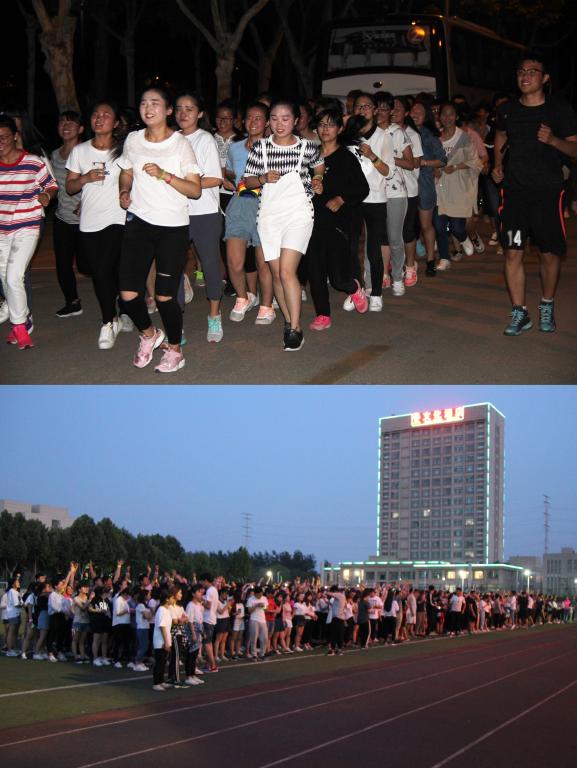 开跑前,活力四射的啦啦操表演与青春洋溢的歌曲点燃了整个西操场。随着团委书记马新蕾的发令枪响,师生正式开跑。同学们手戴各色荧光棒从西操场出发,绕校园奔跑。青春的热情化作一个个跃动的光点点亮夜晚的校园,整支队伍如流动的霓虹灯般闪耀在校园里。在绕校园两周后,各系队伍返回操场指定场地,围坐在一起进行拉歌比赛,伴随着同学们愉快爽朗的歌声笑声,活动圆满结束。