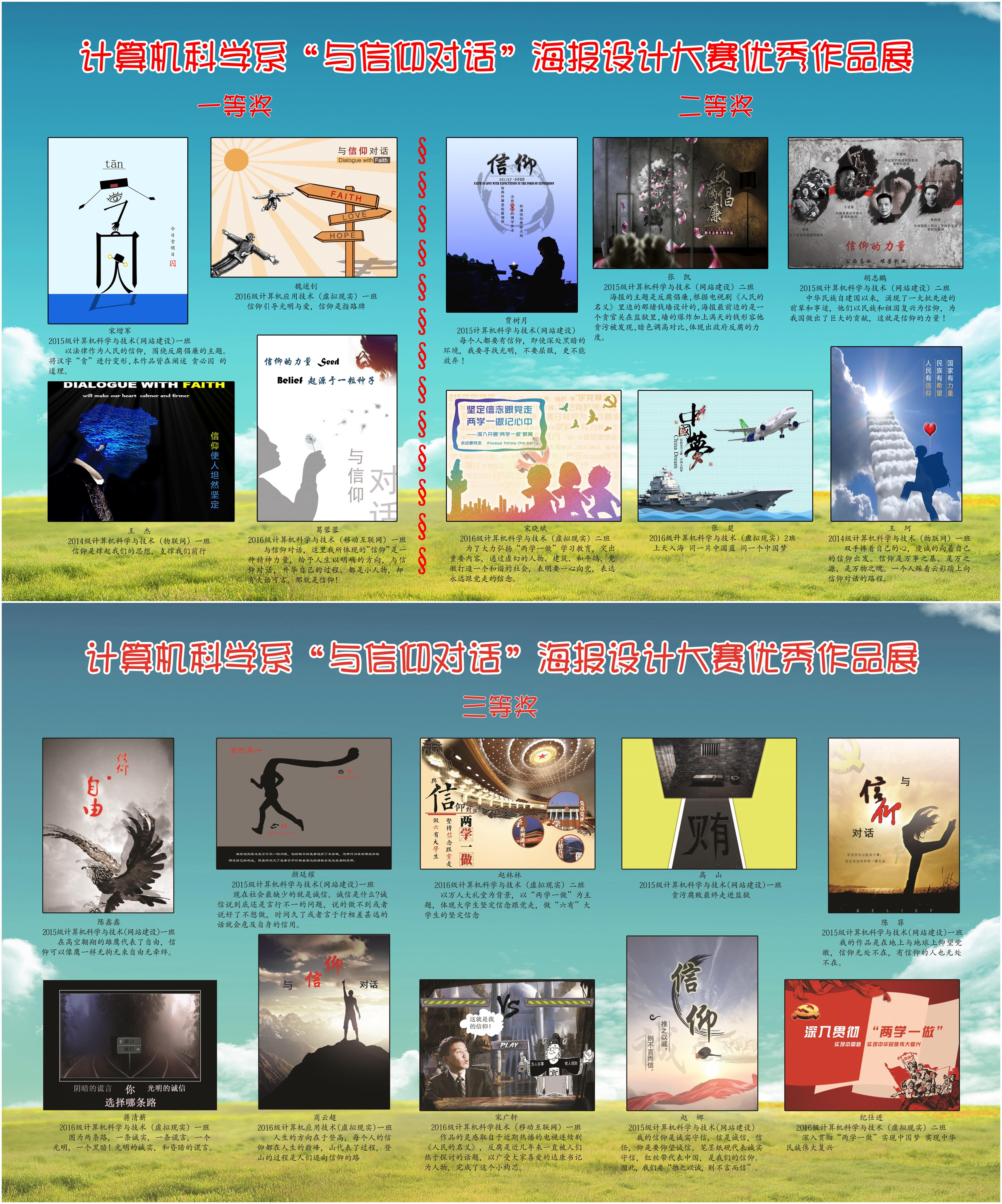 为强化社会主义核心价值观教育,引导广大青年深入学习习近平总书记系列重要讲话,使青年坚定信念跟党走,计算机科学系自5月初至6月上旬历时一个多月,成功举办了以“与信仰对话”为主题的海报设计大赛。