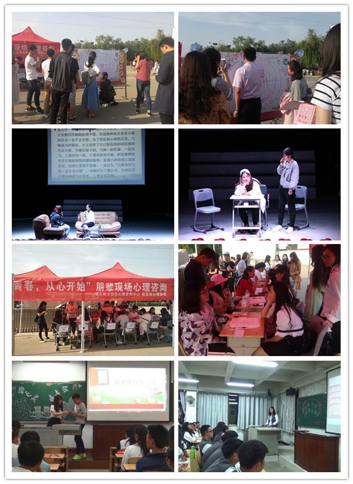 “5·25”大学生心理健康节是我校的特色传统活动,从4月1日拉开序幕,先后举办了主题鲜明、形式多样、丰富多彩的一系列活动:首届大学生朋辈心理辅导技能大赛;第二届心理健康教育主题班会大赛;宿舍和“二人世界”团体沙盘游戏体验活动;每人一笔,“绘”出学校校徽的“一笔画”抒发校园情活动;“关爱青春 从心开始”校园现场朋辈心理辅导;大学生心理情景剧短片DV大赛等活动。活动贴近学生心理实际,得到了各系(院)的大力支持,吸引了广大同学的积极参与。同时根据我校实际,积极参与山东省大学生心理健康节的评选活动。