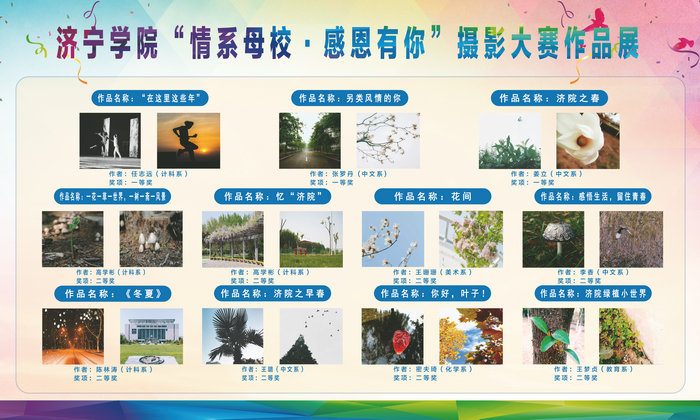 日前,学生工作处(武装部)主办、计算机科学系承办的济宁学院“情系母校•感恩有你”摄影大赛落下帷幕。