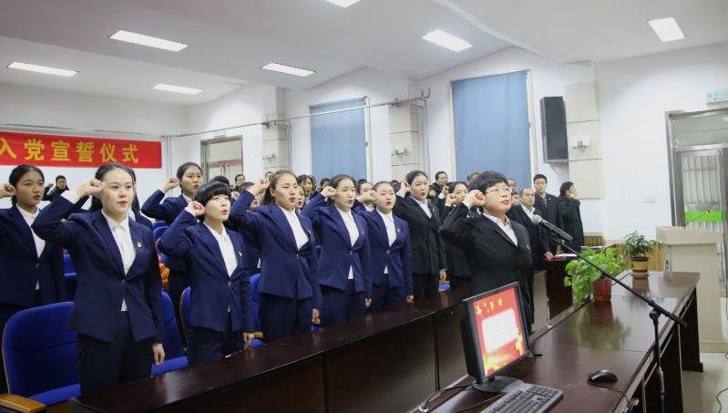 庄严的《国际歌》后,李肇勤同志郑重宣读了预备党员名单,19名预备党员在丰琳琳同志带领下庄严宣誓,全体正式党员重温入党誓词。预备党员代表尚峥峥、老党员代表高峰同志发言,表达对党的忠诚;入党积极分子代表姜鑫茹同学发言,表达对党组织的向往。马云水同志向预备党员提出殷切希望,并要求全体党员要更加紧密团结在以习近平同志为核心的党中央周围,把对社会主义和共产主义的信念作为毕生的执着追求,在“做合格党员”上下真功夫、实功夫、苦功夫,牢固树立“四个意识”、坚定“四个自信”、自觉做到“两个维护”,严守政治纪律和政治规矩,努力学习,积极工作。
