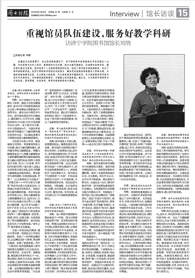 在儒家文化的熏陶下,在全民阅读的指引下,我校图书馆围绕书香校园这一主题,积极发挥文化育人作用,重视传统文化资源与地方文献资源建设,打造特色品牌服务活动,主动服务应用型人才培养,进而培养了一支高效专业的馆员队伍,拉近了图书馆与读者的距离,树立了图书馆的新形象。2019年1月18日,《图书馆报》以“重视馆员队伍建设,服务好教学科研”为主题,对我校图书馆馆长刘欣进行专访,此次专访,在业界引起较多反响,也更加促使我们解放思想,从满足读者的需求出发,关注读者信息环境的变化,与时俱进创新服务,跟上时代发展的步伐。